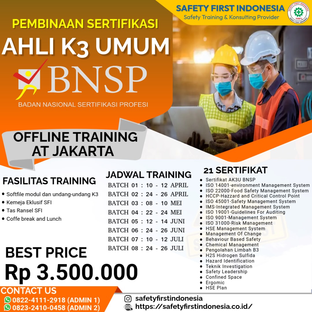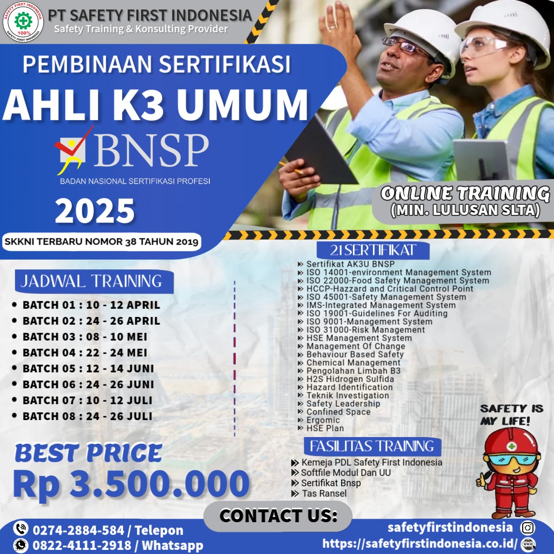 PT SAFETY FIRST INDONESIA 100% Safety Training & Konsulting Provider PEMBINAAN SERTIFIKASI AHLI K3 UMUM BNSP BADAN NASIONAL SERTIFIKASI PROFESI 2025 ONLINE TRAINING (MIN. LULUSAN SLTA) SKKNI TERBARU NOMOR 38 TAHUN 2019   JADWAL 2025:     BATCH 01 : 10 - 12 APRIL  BATCH 02 : 24 - 26…
